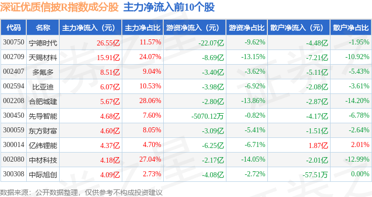 资金流向方面,深证优质信披R(470065)指数成份股当日主力资金净流入合计97.89亿元,游资资金净流出合计66.22亿元,散户资金净流出合计31.67亿元。成份股资金流向详情见下表: