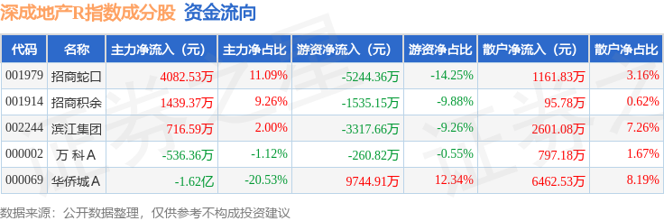 资金流向方面,深成地产R(471001)指数成份股当日主力资金净流出合计1.05亿元,游资资金净流出合计613.07万元,散户资金净流入合计1.11亿元。成份股资金流向详情见下表: