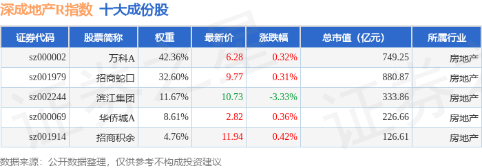 证券之星消息,11月13日,深成地产R(471001)指数报收于725.38点,跌0.11%,成交21.49亿元,换手率1.54%。当日该指数成份股中,上涨的有4家,招商积余以0.42%的涨幅领涨,下跌的有1家,滨江集团以3.33%的跌幅领跌。