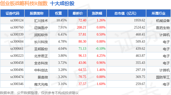 创业板战略科技R(471004)指数十大成份股详情如下: