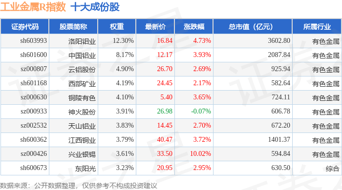 工业金属R(480043)指数十大成份股详情如下: