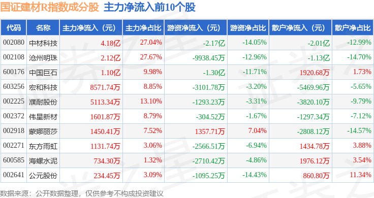 资金流向方面,国证建材R(480048)指数成份股当日主力资金净流入合计6.32亿元,游资资金净流出合计6.07亿元,散户资金净流出合计2544.25万元。成份股资金流向详情见下表: