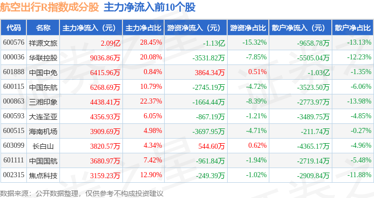 资金流向方面,航空出行R(480059)指数成份股当日主力资金净流出合计2.33亿元,游资资金净流出合计2.9亿元,散户资金净流入合计5.24亿元。成份股资金流向详情见下表: