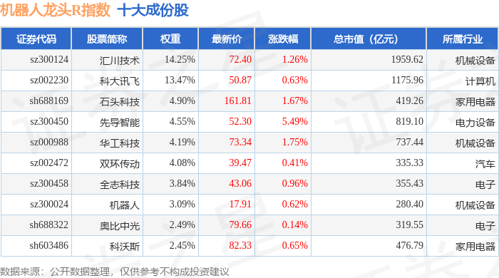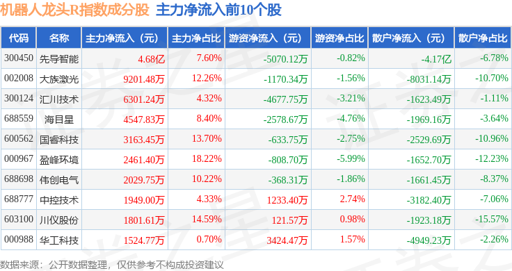 资金流向方面,机器人龙头R(480071)指数成份股当日主力资金净流入合计1.25亿元,游资资金净流出合计2.22亿元,散户资金净流入合计9761.99万元。成份股资金流向详情见下表: