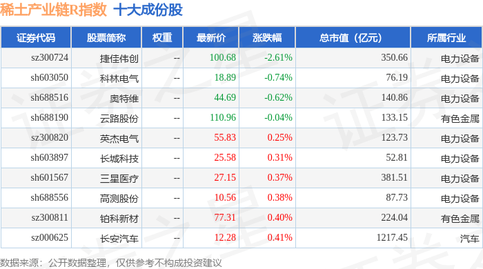 证券之星消息,11月13日,稀土产业链R(489013)指数报收于4262.71点,涨4.02%,成交1279.5亿元,换手率2.88%。当日该指数成份股中,上涨的有46家,上能电气以20.0%的涨幅领涨,下跌的有4家,捷佳伟创以2.61%的跌幅领跌。