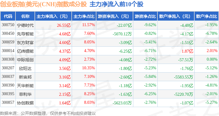 资金流向方面,创业板指(美元)(CNH)(970007)指数成份股当日主力资金净流入合计57.19亿元,游资资金净流出合计43.13亿元,散户资金净流出合计14.05亿元。成份股资金流向详情见下表: