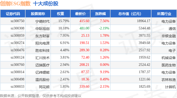资金流向方面,创指ESG(970028)指数成份股当日主力资金净流入合计53.68亿元,游资资金净流出合计40.34亿元,散户资金净流出合计13.34亿元。成份股资金流向详情见下表: