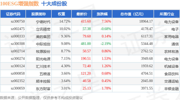 资金流向方面,100ESG增强(970033)指数成份股当日主力资金净流入合计43.12亿元,游资资金净流出合计36.78亿元,散户资金净流出合计6.34亿元。成份股资金流向详情见下表: