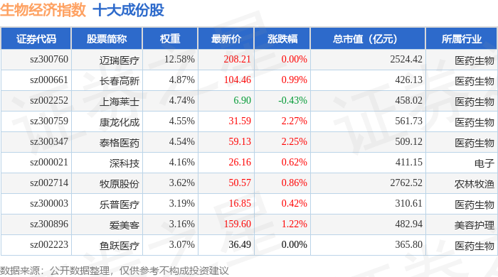 证券之星消息,11月13日,生物经济(970038)指数报收于2266.0点,涨0.61%,成交190.2亿元,换手率1.36%。当日该指数成份股中,上涨的有34家,信立泰以5.4%的涨幅领涨,下跌的有15家,美亚光电以1.56%的跌幅领跌。