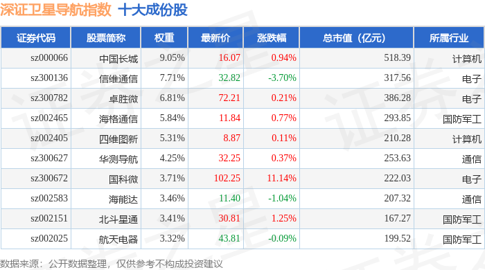 证券之星消息,11月13日,深证卫星导航(970050)指数报收于3213.92点,涨0.61%,成交163.46亿元,换手率2.96%。当日该指数成份股中,上涨的有27家,国科微以11.14%的涨幅领涨,下跌的有14家,信维通信以3.7%的跌幅领跌。
