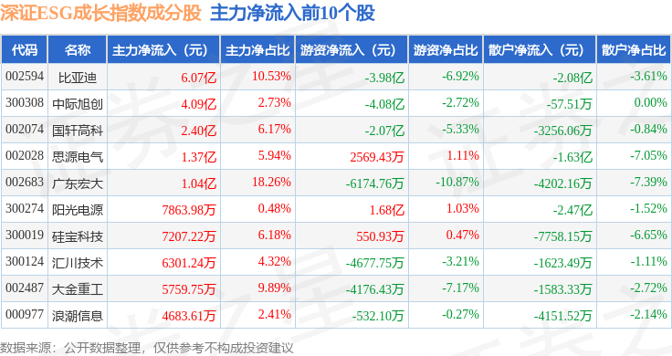资金流向方面,深证ESG成长(970060)指数成份股当日主力资金净流入合计14.79亿元,游资资金净流出合计6.76亿元,散户资金净流出合计8.03亿元。成份股资金流向详情见下表: