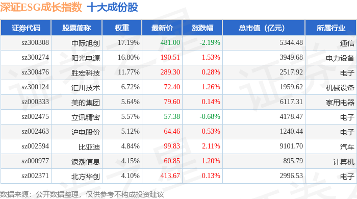 证券之星消息,11月13日,深证ESG成长(970060)指数报收于2198.02点,涨0.48%,成交845.28亿元,换手率1.74%。当日该指数成份股中,上涨的有41家,尚太科技以8.6%的涨幅领涨,下跌的有9家,中际旭创以2.19%的跌幅领跌。