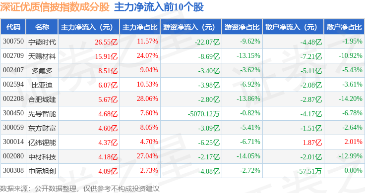 资金流向方面,深证优质信披(970065)指数成份股当日主力资金净流入合计97.89亿元,游资资金净流出合计66.22亿元,散户资金净流出合计31.67亿元。成份股资金流向详情见下表: