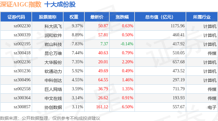证券之星消息,11月13日,深证AIGC(970075)指数报收于2490.6点,涨1.21%,成交309.25亿元,换手率1.66%。当日该指数成份股中,上涨的有28家,协创数据以6.5%的涨幅领涨,下跌的有2家,岩山科技以0.14%的跌幅领跌。