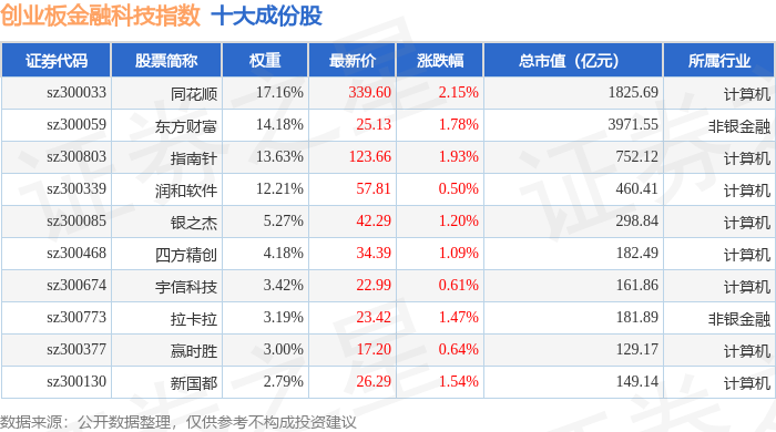 创业板金融科技(970085)指数十大成份股详情如下: