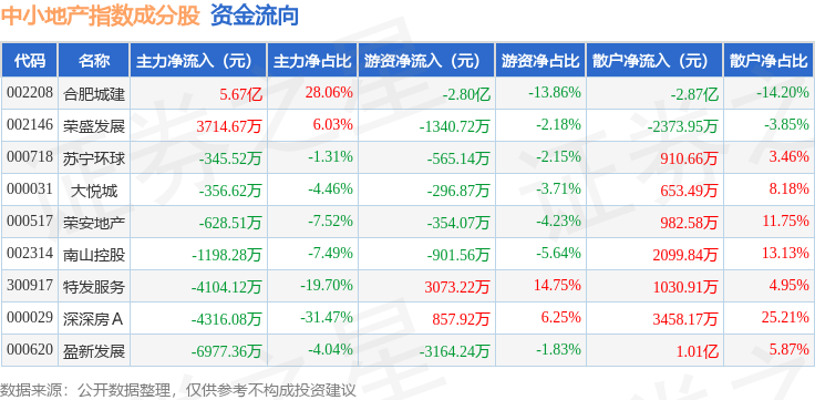 资金流向方面,中小地产(971002)指数成份股当日主力资金净流入合计4.25亿元,游资资金净流出合计3.07亿元,散户资金净流出合计1.18亿元。成份股资金流向详情见下表:
