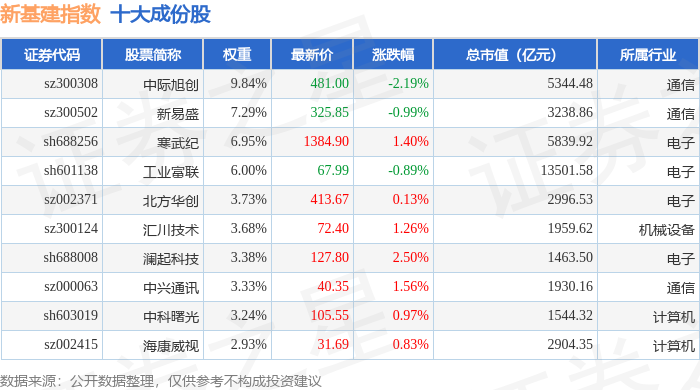 证券之星消息,11月13日,新基建(980029)指数报收于7113.5点,涨0.47%,成交1131.33亿元,换手率0.9%。当日该指数成份股中,上涨的有38家,思源电气以6.0%的涨幅领涨,下跌的有11家,中际旭创以2.19%的跌幅领跌。