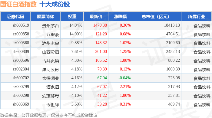 证券之星消息,11月13日,国证白酒(980031)指数报收于70861.54点,涨0.72%,成交152.25亿元,换手率0.84%。当日该指数成份股中,上涨的有20家,金徽酒以2.54%的涨幅领涨,下跌的有6家,皇台酒业以2.39%的跌幅领跌。