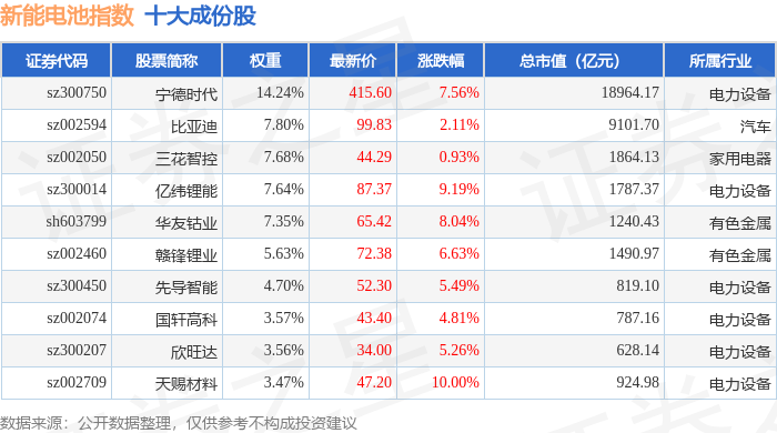 新能电池(980032)指数十大成份股详情如下: