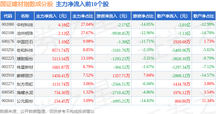 资金流向方面,国证建材(980048)指数成份股当日主力资金净流入合计6.32亿元,游资资金净流出合计6.07亿元,散户资金净流出合计2544.25万元。成份股资金流向详情见下表:
