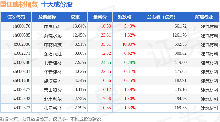 证券之星消息,11月13日,国证建材(980048)指数报收于4947.84点,涨2.19%,成交99.28亿元,换手率1.64%。当日该指数成份股中,上涨的有25家,沧州明珠以10.04%的涨幅领涨,下跌的有5家,金晶科技以5.76%的跌幅领跌。