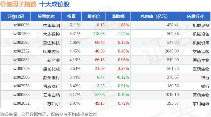 证券之星消息,11月13日,价值因子(980056)指数报收于2677.1点,涨1.29%,成交613.35亿元,换手率1.49%。当日该指数成份股中,上涨的有35家,上能电气以20.0%的涨幅领涨,下跌的有15家,伟星股份以1.77%的跌幅领跌。