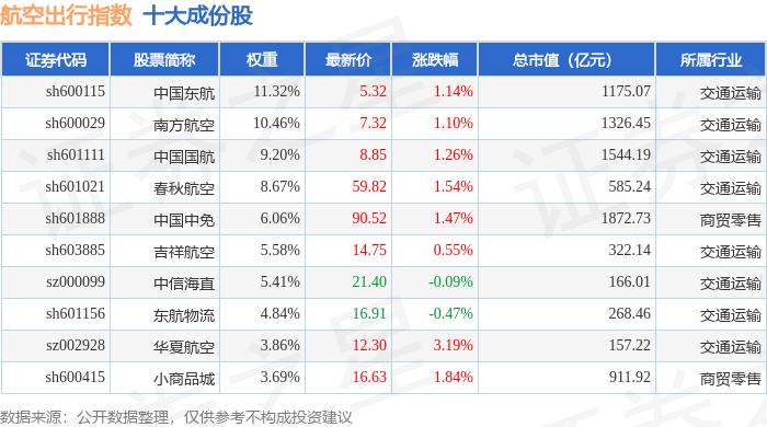 航空出行(980059)指数十大成份股详情如下: