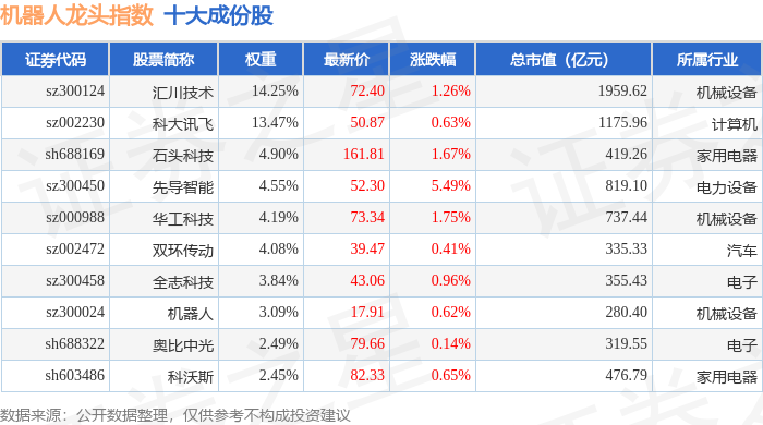 机器人龙头(980071)指数十大成份股详情如下: