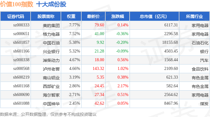 证券之星消息,11月13日,价值100(980081)指数报收于4543.01点,涨0.46%,成交664.97亿元,换手率0.96%。当日该指数成份股中,上涨的有55家,海陆重工以7.14%的涨幅领涨,下跌的有38家,模塑科技以5.47%的跌幅领跌。