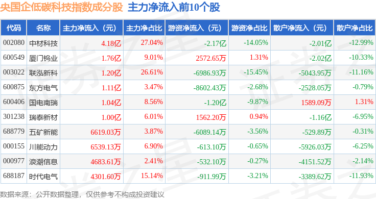 资金流向方面,央国企低碳科技(980082)指数成份股当日主力资金净流入合计5.22亿元,游资资金净流出合计2.32亿元,散户资金净流出合计2.9亿元。成份股资金流向详情见下表: