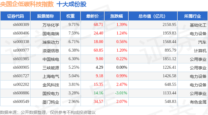 央国企低碳科技(980082)指数十大成份股详情如下: