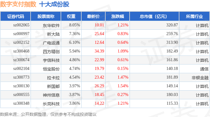 证券之星消息,11月13日,数字支付(980113)指数报收于1822.88点,涨0.94%,成交174.96亿元,换手率1.81%。当日该指数成份股中,上涨的有46家,石基信息以10.02%的涨幅领涨,下跌的有4家,博实结以0.99%的跌幅领跌。