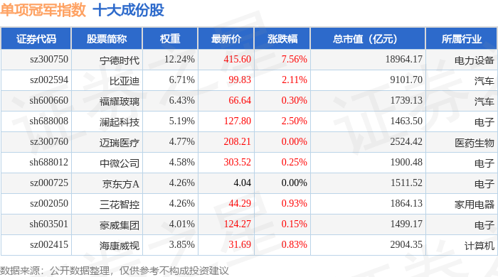 证券之星消息,11月13日,单项冠军(980150)指数报收于8345.44点,涨1.95%,成交1327.92亿元,换手率1.69%。当日该指数成份股中,上涨的有39家,新宙邦以17.49%的涨幅领涨,下跌的有9家,亿联网络以1.06%的跌幅领跌。