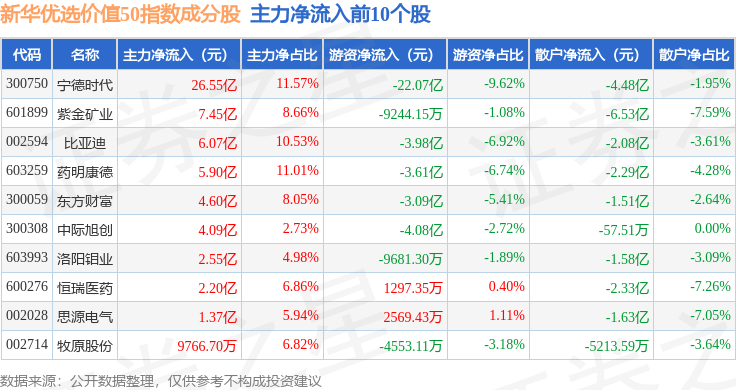 资金流向方面,新华优选价值50(989004)指数成份股当日主力资金净流入合计50.84亿元,游资资金净流出合计32.26亿元,散户资金净流出合计18.58亿元。成份股资金流向详情见下表: