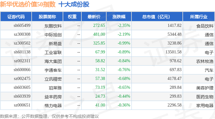 证券之星消息,11月13日,新华优选价值50(989004)指数报收于2207.89点,涨1.44%,成交1773.43亿元,换手率1.02%。当日该指数成份股中,上涨的有38家,宁德时代以7.56%的涨幅领涨,下跌的有12家,东鹏饮料以2.35%的跌幅领跌。