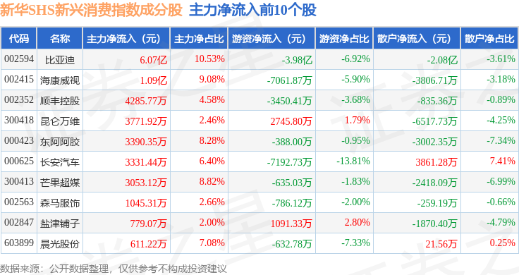 资金流向方面,新华SHS新兴消费(989006)指数成份股当日主力资金净流入合计3.72亿元,游资资金净流出合计2.71亿元,散户资金净流出合计1.01亿元。成份股资金流向详情见下表: