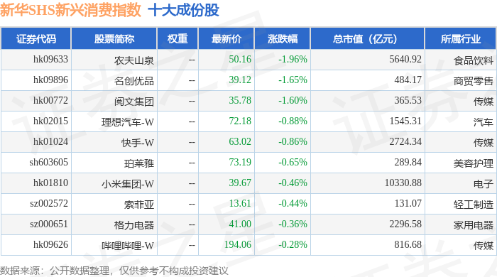 新华SHS新兴消费(989006)指数十大成份股详情如下: