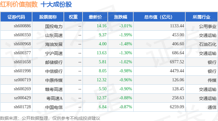证券之星消息,11月13日,红利价值(989016)指数报收于4560.48点,涨0.25%,成交291.46亿元,换手率0.27%。当日该指数成份股中,上涨的有22家,景津装备以3.9%的涨幅领涨,下跌的有24家,国投电力以3.01%的跌幅领跌。