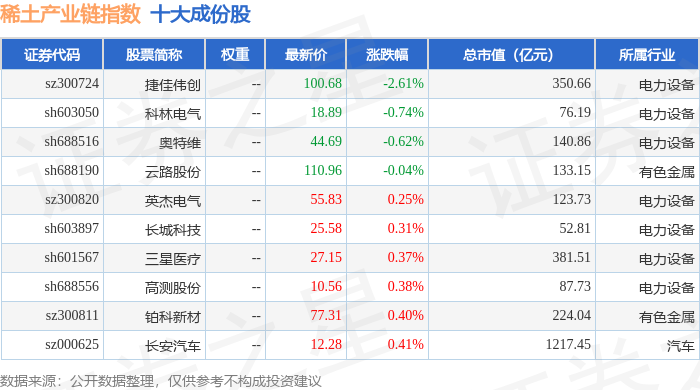 证券之星消息,11月13日,稀土产业链(989013)指数报收于3915.87点,涨4.02%,成交1279.5亿元,换手率2.88%。当日该指数成份股中,上涨的有46家,上能电气以20.0%的涨幅领涨,下跌的有4家,捷佳伟创以2.61%的跌幅领跌。