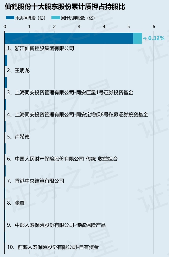 截止本公告日,股东浙江仙鹤控股集团有限公司已累计质押股份3500.0万股,占其持股总数的6.32%。本次质押后仙鹤股份十大股东的累计质押股份占持股比例(占持股比例的计算以公司最新一期财务报表公布的十大股东的持股总数为基准)见下图: