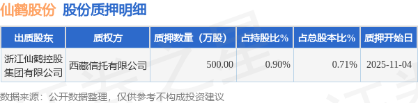 证券之星消息,仙鹤股份(603733)11月13日公开信息显示,股东浙江仙鹤控股集团有限公司向西藏信托有限公司合计质押500.0万股,占总股本0.71%。质押详情见下表: