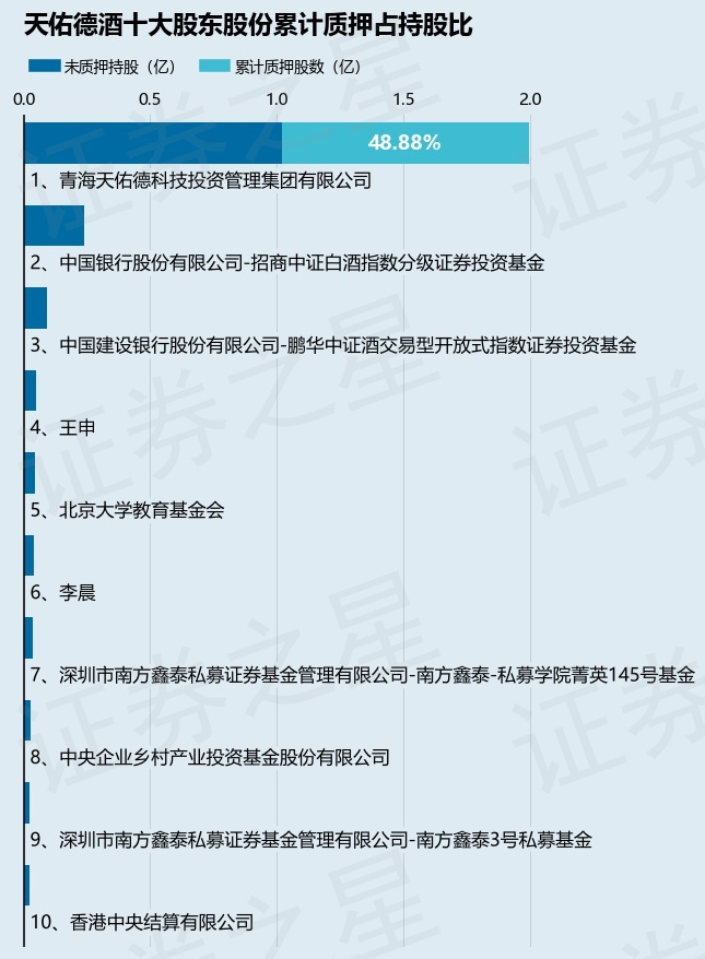 截止本公告日,股东青海天佑德科技投资管理集团有限公司已累计质押股份9750.0万股,占其持股总数的48.88%。本次质押后天佑德酒十大股东的累计质押股份占持股比例(占持股比例的计算以公司最新一期财务报表公布的十大股东的持股总数为基准)见下图: