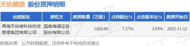 证券之星消息,天佑德酒(002646)11月13日公开信息显示,股东青海天佑德科技投资管理集团有限公司向国泰海通证券股份有限公司合计质押1450.0万股,占总股本3.03%。质押详情见下表: