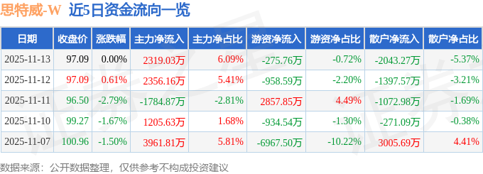 11月13日的资金流向数据方面,主力资金净流入2319.03万元,占总成交额6.09%,游资资金净流出275.76万元,占总成交额0.72%,散户资金净流出2043.27万元,占总成交额5.37%。