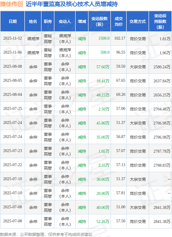 捷佳伟创近半年内的董监高及核心技术人员增减持详情如下: