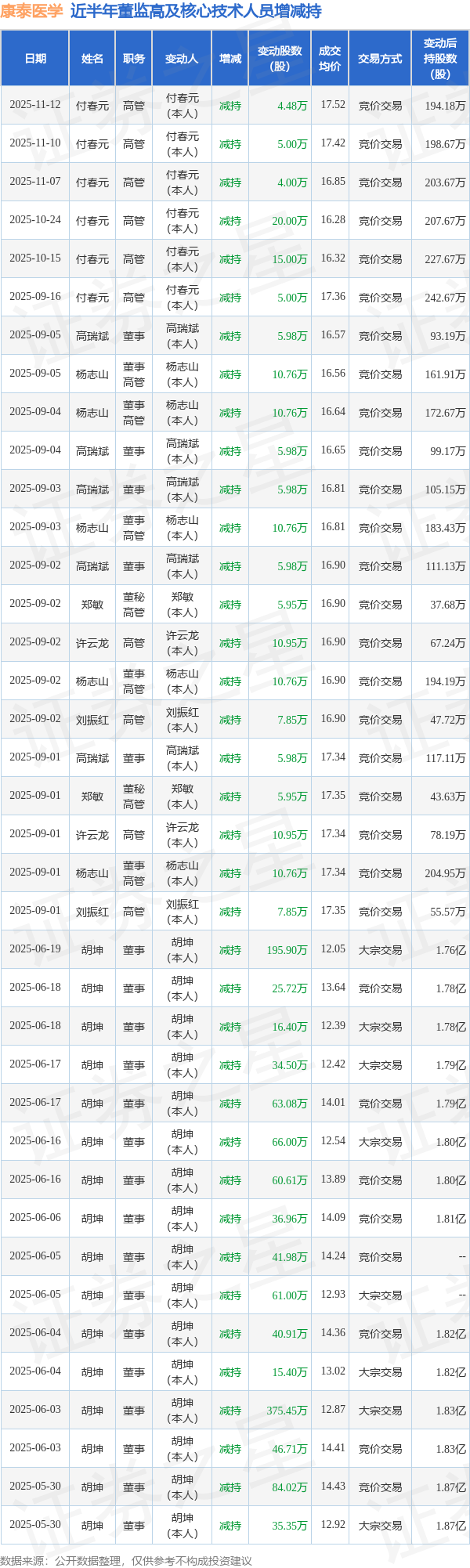 康泰医学近半年内的董监高及核心技术人员增减持详情如下: