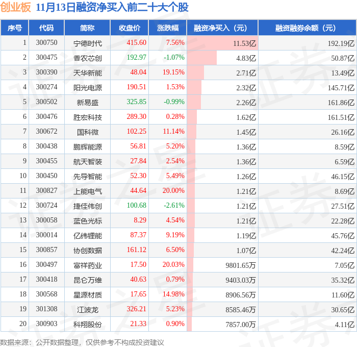 创业板融资净买入前三分别为:宁德时代(300750)融资净买入11.53亿元、香农芯创(300475)融资净买入4.83亿元、天华新能(300390)融资净买入2.71亿元,前20具体见下表: