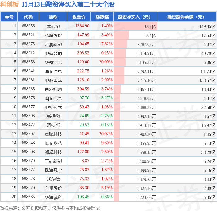 科创板融资净买入前三分别为:寒武纪(688256)融资净买入3.07亿元、芯原股份(688521)融资净买入1.04亿元、万润新能(688275)融资净买入9287.07万元,前20具体见下表: