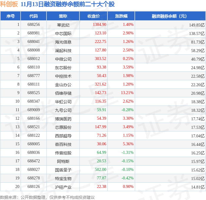 科创板融资融券余额前三分别为:寒武纪(688256)融资融券余额149.85亿元、中芯国际(688981)融资融券余额138.57亿元、海光信息(688041)融资融券余额81.73亿元,前20具体见下表: