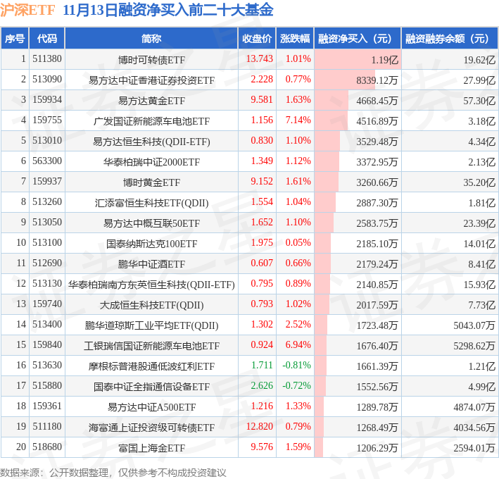 沪深ETF融资净买入前三分别为:博时可转债ETF(511380)融资净买入1.19亿元、易方达中证香港证券投资ETF(513090)融资净买入8339.12万元、易方达黄金ETF(159934)融资净买入4668.45万元,前20具体见下表: